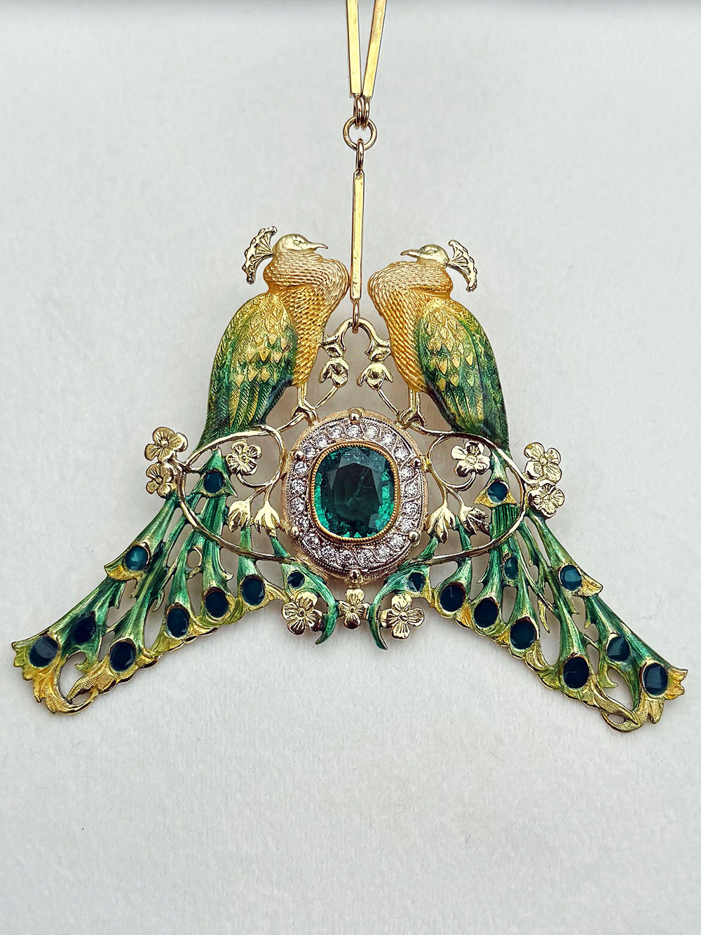 malowanej emalii, która zdobi dwa majestatyczne ptaki oraz delikatne florystyczne motywy. W centrum