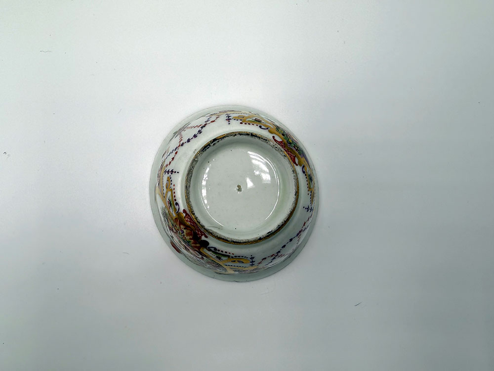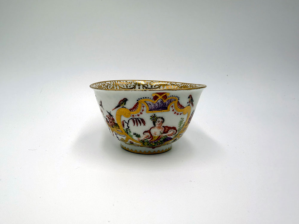Dekoracja filiżanki przedstawia wyrafinowaną kompozycję groteskową z elementami fantastycznymi. Centralnym punktem jest bista kobieca, otoczona złoconym, ornamentalnym kartuszem w stylu rocaille. Po obu stronach rozciągają się stylizowane wstęgi z ptakami, liśćmi akantu i subtelnymi detalami roślinnymi, co nadaje kompozycji lekkości i dekoracyjnej elegancji.