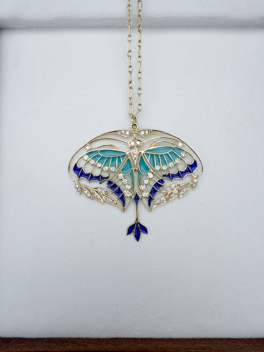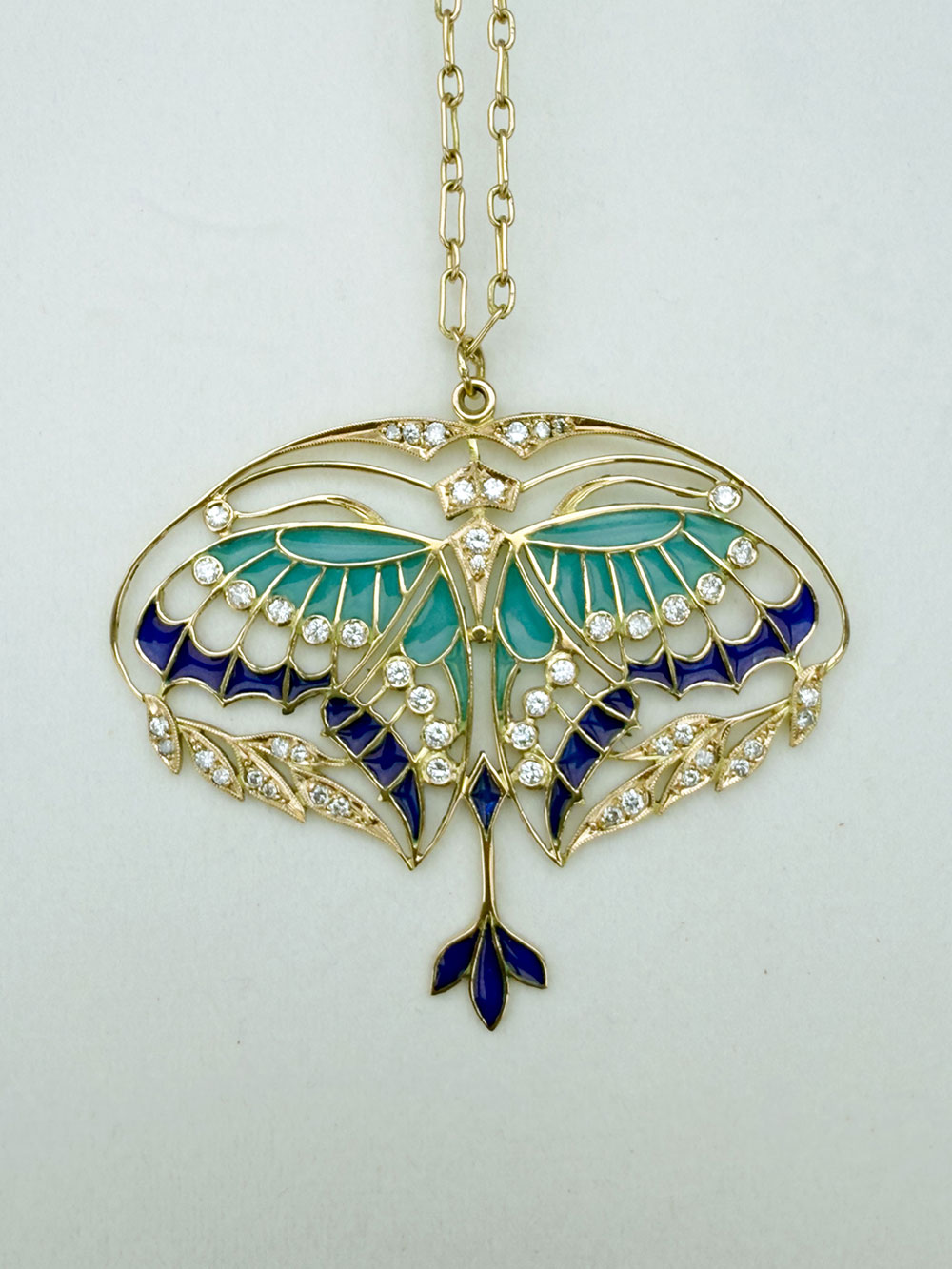 detale przy użyciu rzadkiej techniki emaliowania złota, często nazywanej „plique-à-jour”. Ten wyjątkowy